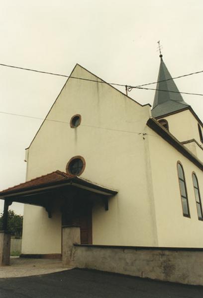 Nef avec mur-pignon percé d'une porte à chambranle mouluré, surmonté d'un fronton et d'une corniche en arc segmentaire. Oculus circulaires au-dessus. Le soubassement de la nef est appareillé et chanfreiné au sommet. Baies en plein cintre. Une porte latérale a été supprimée au sud. Tour-choeur massive, dont les niveaux sont marqués par des bandeaux plats. Flèche à 8 pans. Sacristie contre le mur est, percée de fenêtres rectangulaires. A l'intérieur, une tribune d'orgue au garde-corps plein repose sur deux poteaux de bois, moulurés. Le plafond de la nef est bordé par une gorge aux moulures de gypse ; au-dessus de l'arc triomphal, cartouche sur deux palmes croisées, avec le monogramme I. H. S. Le choeur au rez-de-chaussée de la tour est couvert d'une voûte d'arêtes. Baies en plein cintre sur les faces latérales. Sacristie à l'arrière du maître-autel, atteinte par une porte à chambranle de grès, à petites encoches dans la partie inférieure ; vantail à panneaux, loquet et poignée de fer forgé. Le cimetière s'ouvre depuis le chemin de l'Eglise par une porte à piédroits en grès, ornés de pointes de diamant.