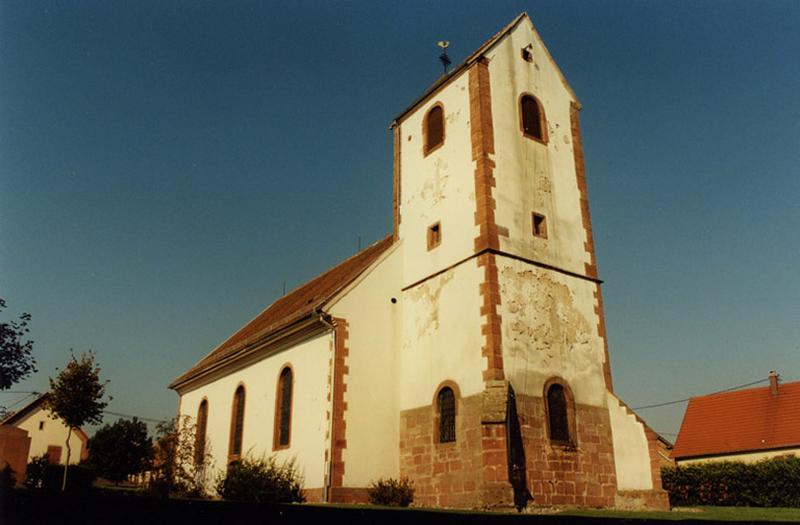 L'église a conservé sa tour-choeur médiévale, dont la partie inférieure, en grès appareillé, pourrait remonter au 13e siècle ; à l'intérieur, une voûte d'ogives paraît postérieure, peut-être du 18e siècle, contemporaine de la reconstruction de la nef, en 1764 (date gravée sur les portes antérieure et latérale). L'église dédiée à l'origine à saint Barthélemy, est devenue une église luthérienne à partir de 1545 (création de la paroisse en 1565). Un porche a été ajouté en 1935 devant l'élévation antérieure. Le cimetière a été déplacé en dehors de l'agglomération (il ne renferme plus aucune tombe antérieure au 20e siècle).