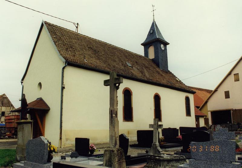 D'après Clauss, l'église daterait de 1724, mais cela semble tout à fait improbable ; le bâtiment actuel date certainement de 1804 (date gravée sur le bénitier à l'entrée) ; il a été agrandi vers l'ouest en 1859, date gravée sur la porte d'entrée, avec les initiales M. L. Les murs ont également été surélevés et les fenêtres de la nef agrandies. Auvent moderne devant la porte d'entrée. L'ancienne église était dédiée à saint Denis et à sainte Odile ; elle abritait un pèlerinage de la sainte, lié à la fontaine miraculeuse située en dehors du village. L'église ne devint paroissiale qu'en 1864.
