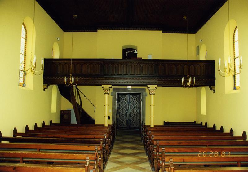 Clocher-porche et élévation antérieure de la nef en grès appareillé ; les autres murs sont en maçonnerie, avec chaînes droites en grès. Porte et fenêtres en plein cintre. Oculus circulaires dans la 1ère travée de la nef. Choeur avec abside demi-circulaire, plus basse. Frise d'arceaux en plein cintre au sommet des murs. A l'intérieur, nef au plafond lambrissé, décor de billettes au sommet des murs. Tribune avec garde-corps plein (décor néo-roman). Arc triomphal en plein cintre, en grès mouluré (tore annelé). Choeur voûté d'arêtes, retombant sur de faux culots peints. Abside couverte en cul-de-four. Porte de sacristie au chambranle de grès.