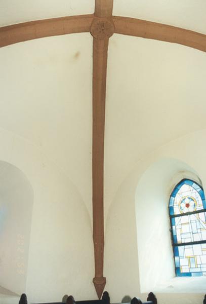 Clocher-porche avec entrée latérale, précédée d'un auvent porté par une colonne en grès. Clocher en briques, à trois niveaux, le dernier percé de baies jumelées en arc brisé. Flèche à quatre pans. Nef avec chaînes d'angle harpées. Corniche en bois, moulurée. Choeur à chevet plat, en grès appareillé, plus étroit et plus bas que la nef. Deux baies en plein cintre et une en arc brisé. A l'intérieur, tribune en encorbellement, avec garde-corps plein. Plafond de la nef à solives apparentes (plaquées). Arc triomphal en arc brisé, maçonné. Choeur voûté d'ogives. Nervures chanfreinées, retombant sur des consoles à trois pans. Clé de voûte circulaire sculptée de cinq feuilles découpées. Fenêtres ébrasées.