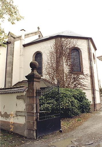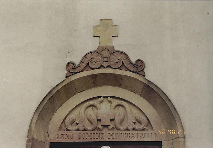 Sur le fonds ancien, l'église précédente apparaît entourée du cimetière, avec en superposition le tracé de la construction future. Cette dernière, plus ample, reprend pratiquement la même orientation hormis le choeur. Celui-ci prend place en effet non plus à l'est mais à l'ouest. Vaisseau plafonné de six travées précédé par une tour- porche de plan carré légèrement hors-oeuvre et suivi par un choeur à cinq pans plus étroit également plafonné. A l'exclusion de l'oculus prenant place sur le chevet, des oculi ventilant le comble du vaisseau, des ouvertures cruciformes implantées sur la face avant du premier niveau de la tour, les baies qui éclairent l'édifice, y compris celles bipartites de la chambre des cloches du niveau final à pans coupés de la tour-porche, sont en plein cintre. On accède au lieu de culte par un portail perçant la base de la tour porche et par deux portes secondaires en plein cintre aménagées sur les murs gouttereaux. Chaînes d'angles, soubassement, bandeaux, rives, chambranles, en grès, animent les façades. Une niche à statue est aménagée au-dessus du portail. Les dates portées ont été gravées, l'une en chiffres romains sur la partie inférieure du tympan à décor floral du portail, l'autre en chiffres arabes sur le sommet de la chaîne d'angle nord-ouest. Vaisseau et choeur communiquent par l'intermédiaire d'un arc triomphal en plein cintre. Une tribune d'orgue reposant sur des poteaux en fonte de fer occupe le fond de la nef.