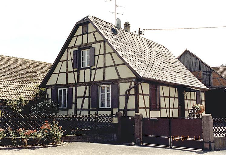 Exploitation agricole adoptant un plan en L en bordure d'une cour ouverte. Elle se compose d'un logis, d'un hangar, d'un fenil, d'une étable et d'une grange. En pan de bois, le logis est en rez-de-chaussée surélevé avec perron et dispose d'un étage de comble. Il se présente en pignon sur rue. Un toit à pans avec demi-croupe le couvre. Un auvent en zinc protège l'entrée. Le millésime prend place sur un des poteaux corniers. Des piédroits en grès de porte piétonne et charretière ont été conservés en place.