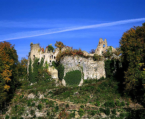 La 1ère mention sûre du château remonte à 1271 date à laquelle le comte de Ferrette en fit oblation à l'évêque de Bâle ; les Morimont, vassaux des Ferrette reconstruisirent leur château au 15e siècle et au 16e siècle ; en 1582 ils le vendirent aux comtes d'Ortenbourg Salamanque qui le conservèrent jusqu'à la guerre de Trente Ans pendant laquelle il fut ruiné par les troupes françaises ; en 1641 Louis XIV en fit don avec la seigneurie aux Vignacourt qui en restèrent maîtres jusqu'à la Révolution ; il fut successivement acquis par Jean Bruat et Aaron Meyer ; il appartient depuis 1870 à la famille Viellard ; le château primitif, dit aussi Niedere Burg, situé à l'ouest du château actuel, dont subsistent très peu de vestiges datait peut-être du 12e ou du 13e siècle ; il a été détruit au plus tard au 16e siècle ; la partie la plus ancienne du château actuel date du 13e ou 14e siècle et correspond à la tour en U de l'angle sud, appelé donjon par la plupart des auteurs, construite sur le rocher et ayant abrité le 1er logis ; la tour d'angle sud-ouest dite Schlossturm, date du 15e siècle ainsi qu'une partie de la courtine ouest et de la courtine sud englobée dans la reconstruction du 16e siècle ; celle-ci s'est faite en plusieurs campagnes : au nord le grand logis de 1552, à l'emplacement probable de l'ancienne basse-cour, flanqué par 2 grosses tours d'artillerie dont celle de l'angle nord-est était datée de 1515 et portait les armoiries de Hans Jacob de Morimont et celles de son épouse Margarete de Furtenberg, au sud, le 2e logis dont subsiste une tourelle d'escalier, l'entrée du château défendue par une tour basse casematée et par une barbacane, au milieu de la courtine ouest, tour adossé au puits qu'il protège ; cette reconstruction commencée vers 1513 a dû s'arrêter avant 1538 et rester inachevée car le fossé extérieur n'a été que commencé ; l'adaptation du château à l'artillerie est moderne dans sa conception mais sans grande valeur militaire car dominée sur 3 côtés par des hauteurs, ses formes Renaissance sont particulièrement précoces pour l'Alsace et s'expliquent par les relations françaises des Morimont ; le château a servi de carrière jusqu'à sa restauration par Quiquerez à partir de 1864