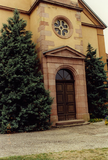 tour porche,porte en plein-cintre,fronton,chevet plat,colonne