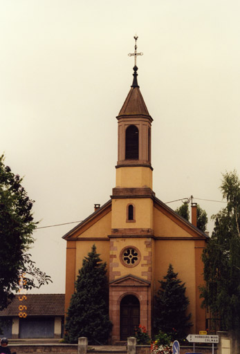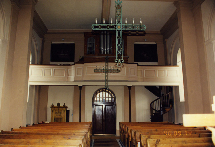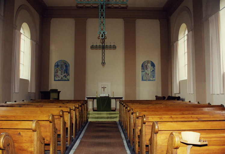 Le chevet plat rétréci tient lieu de sacristie, accessible par une porte centrale dans la nef. A l'intérieur, la tribune galbée en plan repose sur des colonnettes en fonte, cannelées.