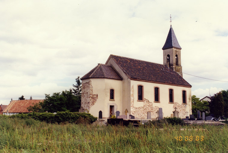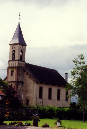 La première église, mentionnée dès 1315, apparaît sur un plan de Sébastien Munster, imprimé en 1545, avec une tour couverte d'un toit à deux versants. En 1371, elle est citée comme paroisse. En 1536, les comtes de Wurtemberg introduisirent la Réforme et dès 1564 fut créée la paroisse protestante. Depuis 1687, date de l'adoption du simultaneum, le choeur est réservé aux catholiques. L'édifice médiéval fut démoli pour raison de vétusté en 1860, et une nouvelle église élevée en 1863. Le millésime figure gravé sur le linteau de la porte. Gravement endommagée pendant la Deuxième Guerre mondiale, où la toiture et tout l'intérieur furent incendiés, l'édifice subit, en 1947, des réparations importantes. Une restauration complète est actuellement en cours d'études.