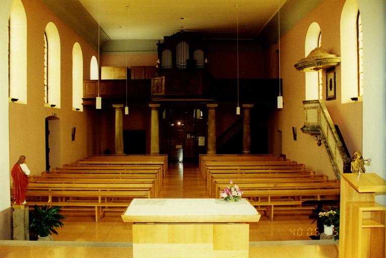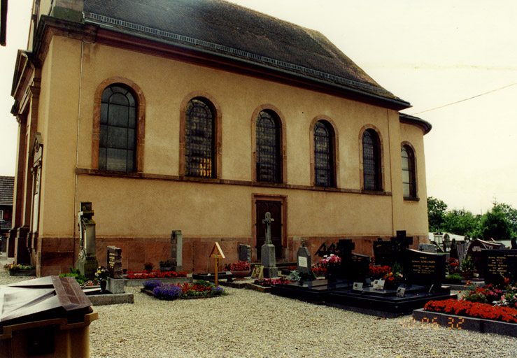 Eglise à nef unique plafonnée à cinq travée de fenêtres, un choeur semi-circulaire et une sacristie flanquant celui-ci au sud. L'ancienne tour-choeur, aujourd'hui accolée au sud de la dernière travée est de la nef comporte un rez-de-chaussée et quatre étages. Le premier niveau est voûté d'arêtes reposant sur des colonnes d'angles semi-engagées à chapiteaux cubiques et bases ornées de griffes d'angles. Dans le mur ouest : l'arc triomphal qui permettait de communiquer avec l'ancienne nef. Le troisième niveau de la tour est percé de baies géminées en plein cintre reposant sur des colonnettes à section octogonale (sur trois de ses côtés, le quatrième est masqué par la nef). La maçonnerie de la tour est principalement composée de moellons de grès mais aussi de basalte provenant vraisemblablement du Kayserstuhl (Allemagne).