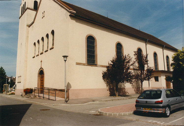 L'église se compose d'une nef à 5 travées, d'un choeur à pans coupés, d'un clocher accolé à la façade à l'ouest, d'une sacristie au nord et d'un porche d'entrée latéral au sud. Décor extérieur limité à un bandeau le long de la nef. A l'intérieur, un arc triomphal en plein cintre sépare le choeur de la nef. La tribune d'orgue est soutenue par 2 colonnes. Entre les 2 parties du buffet d'orgue, la lumière entre par 3 baies en plein cintre. Le plafond à caissons de la nef est en bois.
