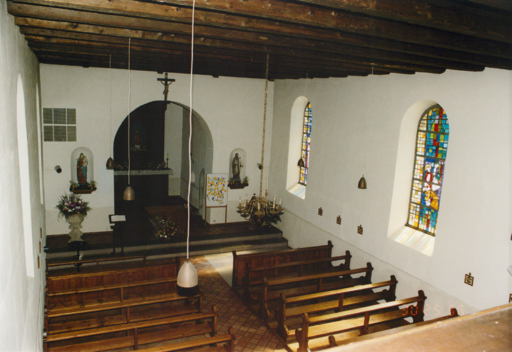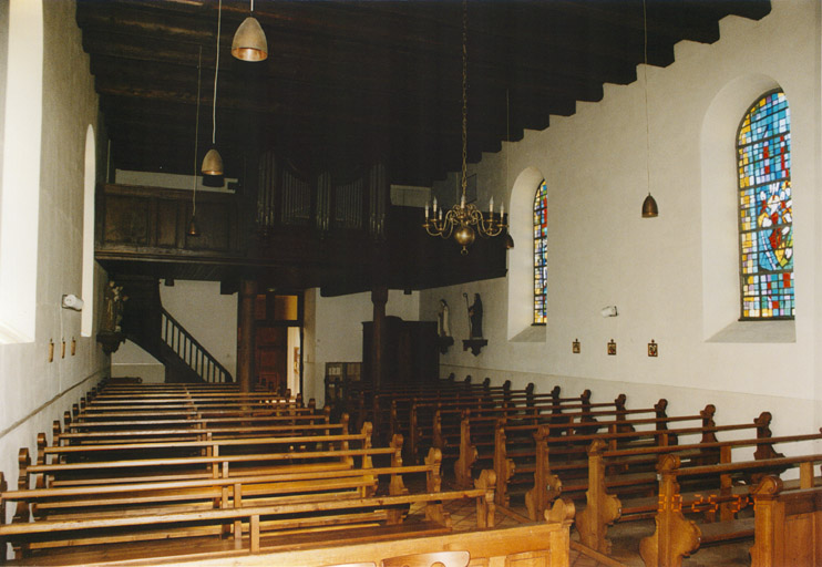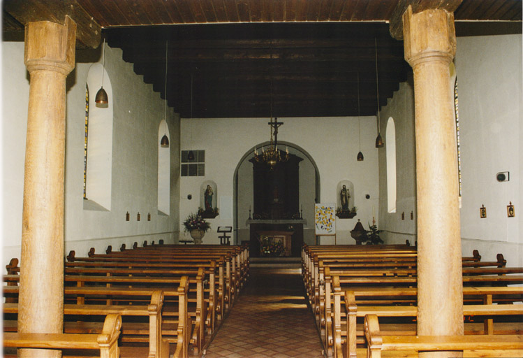 L'église se compose d'une nef unique à 3 travées, d'un choeur carré avec sacristie accolée et d'un clocher porche hors oeuvre. Décor simple : chaînages d'angle enduit, porte d'entrée surmontée d'un fronton triangulaire avec moulures ; fenêtre gothique (in situ ?) dans le mur extérieur est du choeur. A l'intérieur de l'église, le plafond de la nef et du choeur est en poutres apparentes (sapin dans la nef et chêne dans le choeur) ; carrelage et parquet (en chêne) modernes (1979). La porte de la sacristie est en plein cintre chanfreiné avec congés. La tribune d'orgue est soutenue par 2 colonnes en bois.