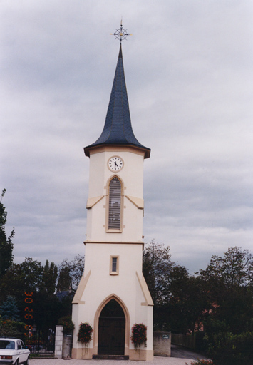 Clocher porche couvert d'une flèche avec une porte en arc brisé flanqué de 4 contreforts. De section carrée à la base, il est octogonal au niveau du beffroi (surélévation de 1892).