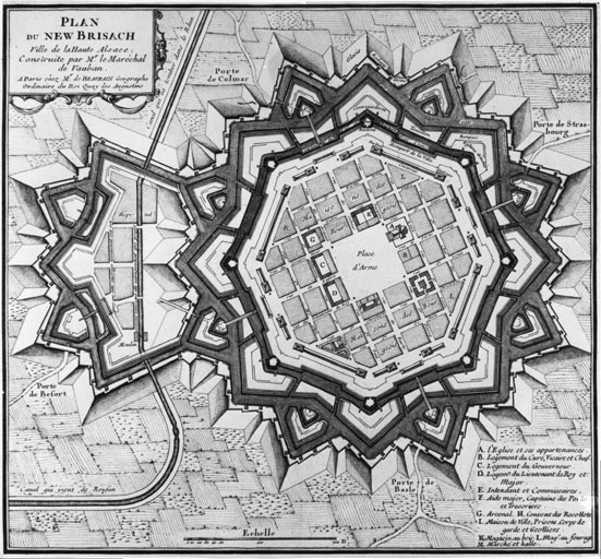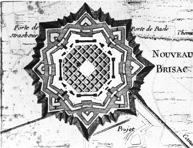 Le traité de Ryswick, signé le 20 septembre et 30 octobre 1697, obligea le roi de France à restituer la place forte de Brisach, française depuis le traité de Westphalie, à la Maison d 'Autriche. Pour pallier cette perte, le roi chargea Vauban, dès 1698, de créer sur la rive gauche du Rhin, non loin de Brisach, une place nouvelle destinée à contrebalancer l'importance stratégique de l'ancienne place forte. Neuf-Brisach fut construit de toutes pièces sur une partie des territoires de Volgelsheim et de Wolfgantzen. La place de Neuf-Brisach fut conçue d'après le troisième système en forme d'octogone régulier avec un ouvrage à couronnes et à tours bastionnées. Vauban partagea la surface de la place en 18 carrés en forme de damier pour y recevoir les bâtiments de l'Etat-major de la Place et ceux des habitants. Les carrés ou îlots faisant face à la place d'armes étaient destinés chacun : à l'église paroissiale, à la maison du gouverneur, au lieutenant du Roi et au major, au commissaire des Guerres et à l'intendant et un à l'hôtel de ville. En définitive, seules l'église et la maison du gouverneur furent édifiées à l'emplacement que leur avait destiné Vauban. Les îlots réservés aux habitants - 10 maisons par carré - devaient permettre la construction de 340 maisons et d'y loger 3500 habitants. Vauban avait prévu pour les troupes : 4 casernes, 2 pour l'infanterie et 2 pour la cavalerie pouvant loger 4000 hommes. Neuf-Brisach subit son 3ème siège, le plus désastreux, en 1870 : 125 maisons furent détruites, 140 autres fortement endommagées et seulement 15 restèrent à peu près intactes, sur 280 au total. La ville fut également bombardée durant la 2e guerre mondiale et subit d'importants dégâts tant militaires que civils.