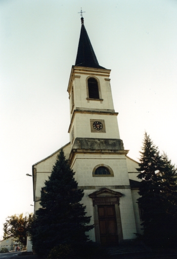 L'église, de style néo-classique, se compose d'une nef à 4 travées, d'un chevet semi-circulaire avec une sacristie accolée au sud, et d'un clocher porche légèrement hors oeuvre. Le clocher porche de plan carré à 4 niveaux, est accessible par un portail à fronton triangulaire. Dans les bas-côtés du porche, 2 niches contiennent les statues de saint Luc et saint Jean. Le 2e niveau est éclairé par une baie semi-circulaire, le 3ème niveau contient l'horloge et 2 statues de saint Luc et saint Mathieu aux angles sur la corniche, le 4ème niveau correspondant au beffroi couvert d'une flèche octogonale à égout retroussé. Des bandeaux séparent les niveaux. A l'intérieur, les fenêtres de la nef et du choeur sont soulignées par une moulure blanche et or de même que l'arc triomphal. Le plafond peint dans la nef représente la Résurrection du Christ. La tribune d'orgue est soutenue par 4 colonnes et 4 piliers engagés.