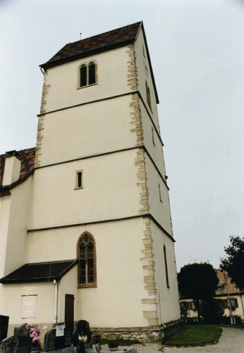 L'église orientée, légèrement excentrée dans le village, le long de la route principale reliant Altkirch à Thann, est située sur une légère éminence. La nef compte 6 travées. La porte est abritée par un auvent soutenu par deux colonnes d'ordre toscan en pierre. Le choeur, de même largeur que la nef, est séparé de celle-ci par un mur dans lequel est pratiqué un arc triomphal en plein cintre. Le maître-autel est placé dans une abside rectangulaire, plus étroite très peu profonde, séparée du choeur par un arc en plein cintre de mêmes dimensions que l'arc triomphal. La tour-choeur est à 4 niveaux, marqués par des cordons, et coiffée d'une couverture en bâtière. Elle est, au rez-de-chaussée, voûtée sur croisées d'ogives, avec une clé de voûte datée. L'espace de l'ancien choeur est actuellement cloisonné. On discerne la trace du solin de l'ancienne nef, sur le mur ouest du clocher, dans les combles actuels. Enfin, on remarque une pierre sculptée (tête d'homme ?) au 3 niveau, sur l'angle nord-est de la tour. Le cimetière autour de l'église forme une terrasse qui surplombe la route et le village.