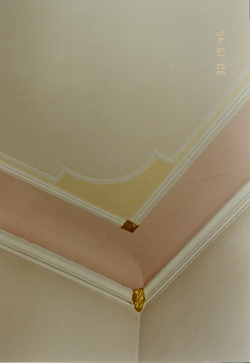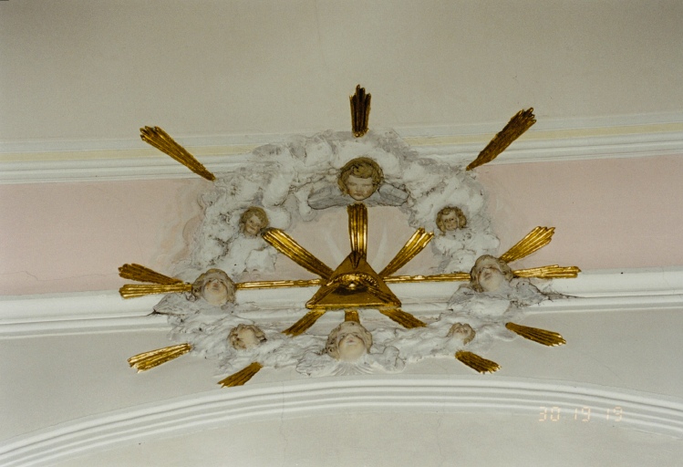 L'église, orientée, se compose d'une nef à 2 travées (avec entrée latérale au nord) , d'un clocher porche hors oeuvre, d'un choeur à pans coupés, d'une sacristie accolée à l'est (dans le prolongement du choeur). Clocher-porche à 4 niveaux, chaînages d'angle harpés sur les 3 premiers niveaux. A l'intérieur, entre le clocher et la nef, ouverture en plein cintre. Plafond mouluré, avec palmettes dans les angles. Arc triomphal décoré d'un triangle trinitaire dans une nuée avec rayons et têtes d'anges ; plafond de la nef : monogramme (IHS) dans un quadrilobe. Tribune d'orgue soutenue par 2 colonnes galbées en bois. Porte d'entrée de la sacristie à arc brisé doté d'une moulure simple.