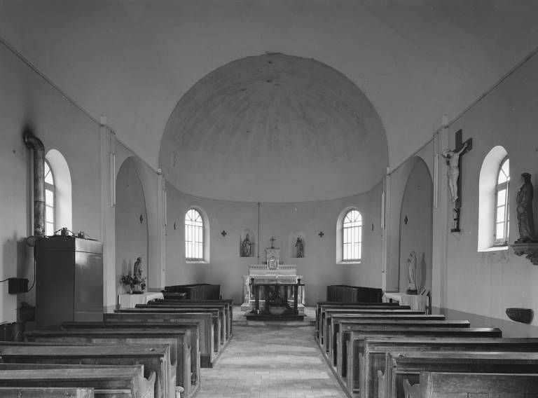 Eglise composée d'un massif-antérieur abritant le vestibule et deux pièces latérales, d'une nef plus étroite et d'un choeur semi-circulaire. Les deux arcades murées de la troisième travée de la nef sont les ouvertures qui devaient donner dans les chapelles latérales mais ne furent jamais construites. Les murs de l'édifice sont en brique sur soubassement en moyen appareil calcaire. Toit en pavillon sur le clocher.