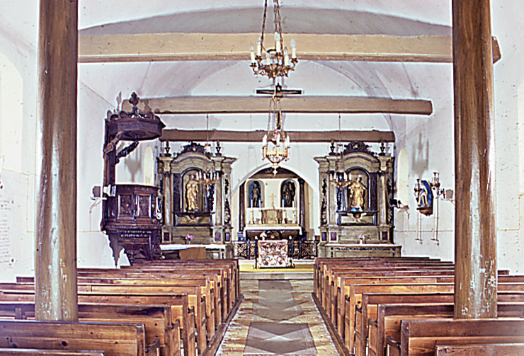 De l'ancienne église du 12e ou 13e siècle, ravagée en 1636 par les troupes de Gallas, subsistent une partie des murs du choeur et de la nef et les piédroits à coussinets encadrant la porte d'entrée. L'édifice a été presque entièrement reconstruit au milieu du 17e siècle et augmenté d'un porche à la fin du 18e ou au début du 19e siècle. La sacristie a été bâtie au 18e siècle et le clocher refait en 1838 sur les plans et devis de Fondet, architecte à Chalon-sur-Saône. Le plafond du choeur et la fausse-voûte de la nef sont des réfections du 19e siècle. L'inscription "Ch. Buchet 1830", peinte en noir sur le mur du choeur derrière le retable, indique sans doute le nom d'un artisan et la date de travaux qu'il a effectués sur l'édifice.