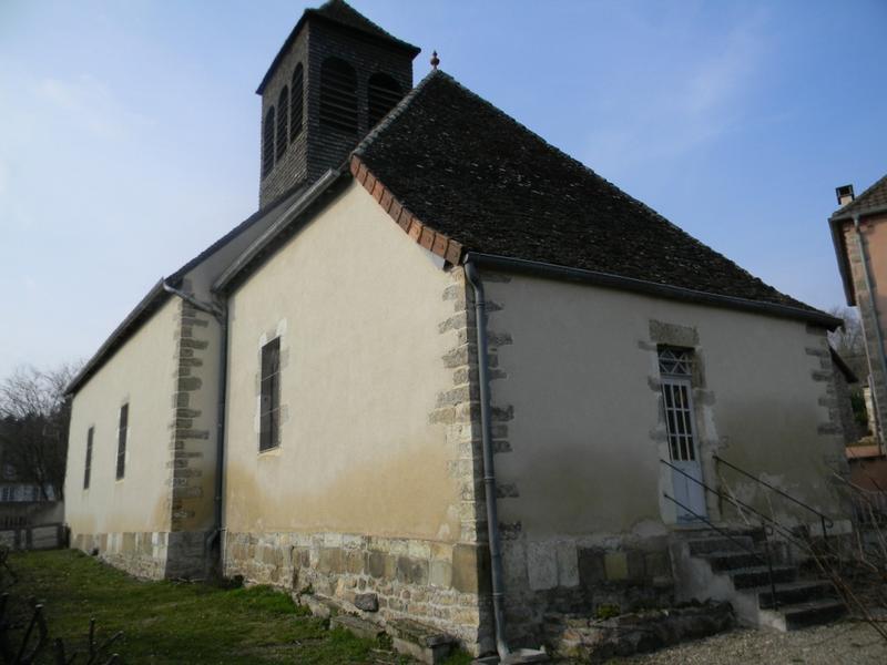 Eglise orientée, de plan allongé, composée d'un premier corps de bâtiment rectangulaire couvert d'un toit à longs-pans de tuiles plates. Murs en maçonnerie enduite avec soubassement en pierre et chaînes d'angle à l'est. Baies rectangulaires, oculus et portail constitué d'une baie en plein-cintre fermée par une porte à double vantaux. Une petite croix en pierre surmonte la façade ouest. À l'extrémité est de ce corps de bâtiment, tour-clocher rectangulaire protégée de bardeaux en bois, percée de baies jumelées (de deux ou trois éléments) en plein-cintre munies d'abat-son et couverte d'un toit en pavillon de tuiles plates. Accolé à l'est, second corps de bâtiment rectangulaire, couvert d'un toit à croupe de tuiles plates et percé d'une lucarne à deux pans. Murs en maçonnerie enduite avec soubassement en pierre et chaînes d'angle à l'est. Baies rectangulaires et escalier droit perpendiculaire à la façade est.