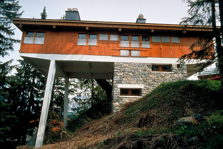Chalet de famille de Georges Lang, industriel à Remiremont. Il prend contact avec Laurent Chappis en mars 1949, acquiert le lot de terrain en janvier 1950 et entreprend l'étude du projet avec l'architecte Denys Pradelle à qui L. Chappis avait demandé de faire les premiers croquis. D. Pradelle propose 5 esquisses successives en février-mars 1950. Ils font le choix d'un principe de chalet surélevé par rapport au sol, permettant de bénéficier d'un maximum de vues, malgré la disposition défavorable des terrains (forte pente d'orientation nord-est) , et offrant une grande façade au sud. Ils optent pour un procédé constructif mixte, combinant une infrastructure en béton armé et une superstructure de type préfabriqué, l'ensemble étant inspiré des contacts établis par Pradelle avec l'atelier Lodz, de Paris, par l'intermédiaire de Jean Coignet, étudiant parisien en stage chez Pradelle. L'ingénieur en béton armé Trezzini, associé de Lodz, collabore à ce projet pour la construction du porte-à-faux (dossier AAM : Numéro 85). Parcelle numéro 122 du plan de lotissement. Chantier réalisé entre août et décembre 1950. Charpente et couverture : Marcel Mugnier, à Courchevel 1850 ; maçonnerie : Etievent ; menuiserie : Blanc-Tailleur, à Brides-les-Bains.