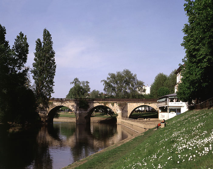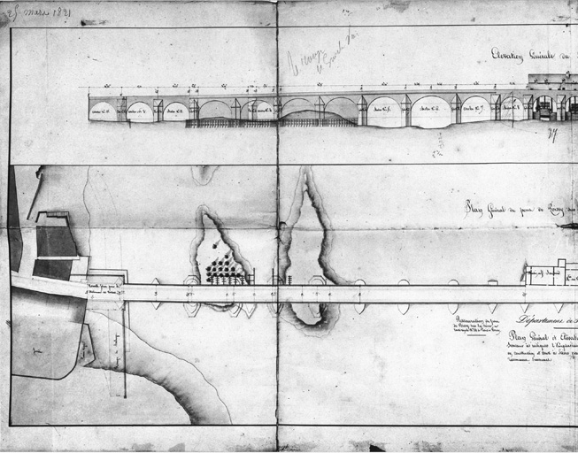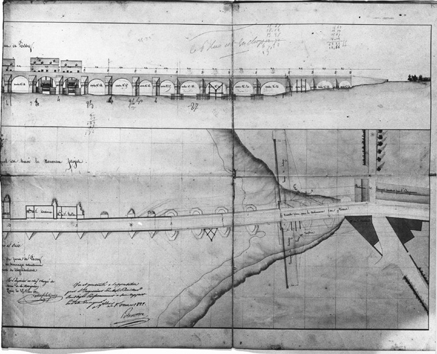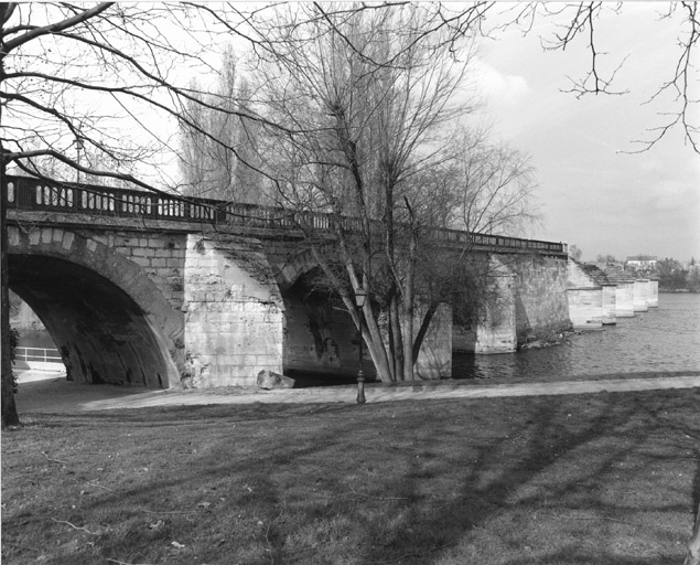 L'existence du pont de Poissy, sur la route de Paris à Rouen, est attestée dès 1162, dans l'acte de fondation du prieuré Saint-Blaise par Thibault de Marly. Il subit au cours des temps de nombreuses destructions : entre 1346-1356, lors de la guerre de cent ans, en 1590 durant le siège de Paris Henri IV fait détruire deux arches, réparées en 1599. A la fin du 17e l'ouvrage est constitué de 24 arches, repose sur deux îlots en milieu de rivière et fait une longueur totale de 406, 70 mètres, état qu'il conserve jusqu'au début du 19e siècle. En 1820, on envisage des travaux de réfection importants : plusieurs arches sont reconstruites et les travaux menés par l'entreprise des ponts et chaussée Cheronnet à Meulan. Des projets de reconstruction sont présentés dont ceux de Coster en 1823 et d'Astier de la Vigerie qui propose un déplacement du pont, 125 m en amont pour en diminuer la longueur. Aucun projet n'est retenu. En 1836, une passerelle de bois remplace des arches manquantes. En 1846, Antoine-Rémi Polonceau, ingénieur en chef des ponts et chaussées en Seine-et-Oise, construit une arche marinière de 32 mètres qui remplace 3 arches. A cette époque le pont ne comporte plus que 15 arches en rivière. E 1874, suppression du deuxième îlot pour construire 2 nouvelles arches. Le pont est fortement endommagé par les bombardements de 1944 est restauré. Une arche marinière est établie sur la rive droite et au centre des arches sont remontées mais cela n'est que provisoire. Déjà en 1938, le pont est jugé insuffisant pour le trafic routier. Des projets de reconstruction sont envisagés, à 200 mètres de l'ancien : en 1947, projet des anciens établissements Eiffel, "pont continu en acier", en 1948 projet adopté de pont en ossature de fer avec culées, piles et garde corps en béton. Ce nouveau pont est inauguré le 19 juillet 1952. Du vieux pont, il ne reste aujourd'hui que les trois premières arches restaurées, les plus anciennes du pont et les dernières arches sur la commune de Carrière-sous-Poissy en ruines.