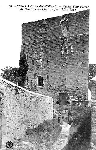 La tour Montjoie dont le nom dériverait de " Mons Jovis " (Mont de Jupiter) est un témoin précieux de la première génération des châteaux de pierre en Île-de-France. Ses origines demeurent obscures. Peut-être a-t-elle succédé à une première fortification en bois. Sa construction est généralement datée de la fin du XIe ou du début du XIIe sur la foi de comparaisons régionales et elle pourrait avoir été élevée par le comte de Beaumont Matthieu 1er, peu après un violent conflit qui l'opposa à son beau-frère, Bouchard IV de Montmorency.