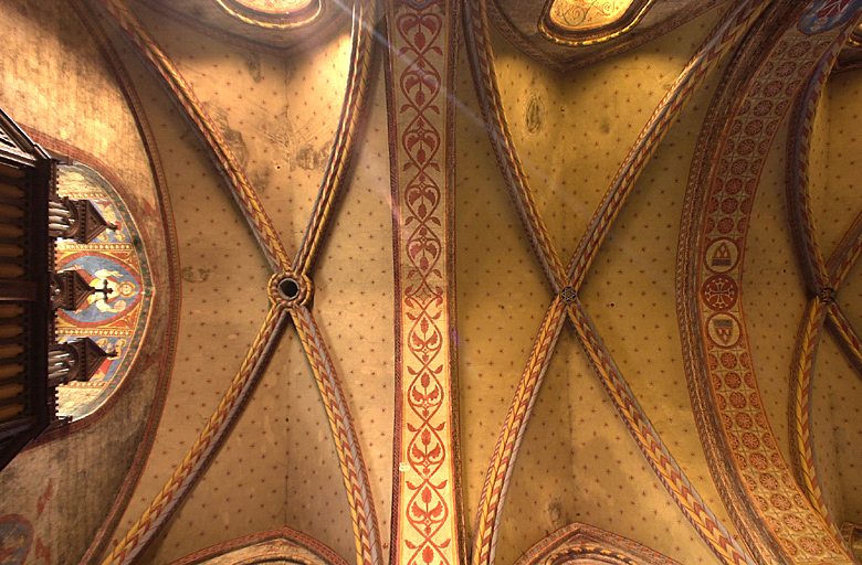 De l'édifice roman du 12e siècle il ne reste que les huits chapiteaux du portail. L'église est conçue comme une vaste nef unique et rectangulaire entièrement en brique et voûtée d'ogives. Longue de 29 mètres et large de 12,15 mètre. Fermée à l'est par un chevet plat à cinq pans, elle compte quatre travées séparées par de larges arcs doubleaux sur dosseret brisés et de profil rectangulaire. Les doubleaux retombent sur des colonnes jumelles en pierre, engagées dans un dosseret et coupées à six mètres de hauteur à la fin du 15e siècle pour placer des bancs ou des stalles le long des murs entre les chapelles. De longues fenêtres en plein-cintre à ébrasement double sont percées au centre des murs de chaque travée. Une rose flamboyante éclaire le mur occidental de la nef.