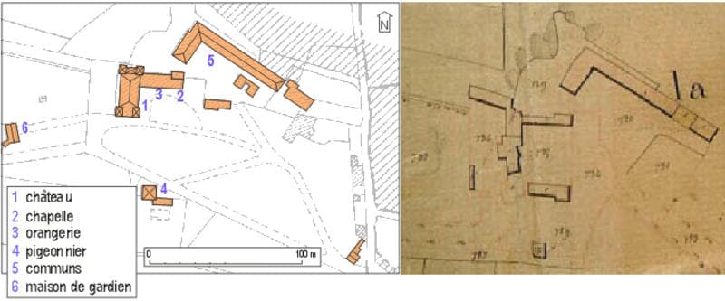 parc ; cour ; logement ; orangerie ; chapelle ; conciergerie ; ferme ; pigeonnier ; carrière ; cellier ; pressoir