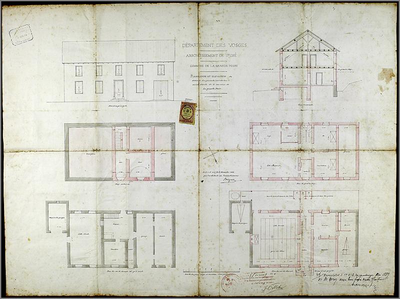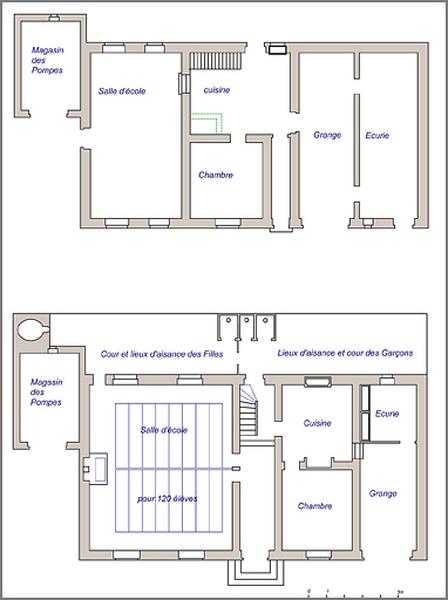L'ancienne école de la Bonne-Fontaine étant devenue trop petite et excentrée, en 1824, la municipalité décide d'acheter un bâtiment mieux situé. Le bâtiment, une ferme, est vraisemblablement rallongé pour y accueillir une salle de classe, les locaux de la mairie sont installés dans la partie habitation, la grange et l'étable garde leurs fonctions. En 1856, la mairie-école est entièrement reconstruite en gardant la même emprise en sol, sur un plan de l'architecte Bruyant par l'entrepreneur Etienne Delubin. Le bâtiment, couvert de bardeaux, comporte alors en sous-sol deux caves, en rez-de-chaussée : une salle de classe double pour 120 élèves, couloir, cuisine, chambre, écurie et grange, au premier étage : la salle communale, un local d'archives, deux chambres et un grenier. Une cour avec trois W.C. est créée. Le beffroi est ajouté en 1860. Bien que le plan prévoie un partage de la salle d'école et de la cour, la séparation des sexes n'est effective qu'à partir de 1873. Le bâtiment devenant exigu, compte tenu du nombre d'élèves, en 1878, une école pour les filles est construite. En 1886, par mesure d'hygiène, la cour d'école est agrandie et pourvue de 6 W.C. et le magasin des pompes attenant est supprimé.