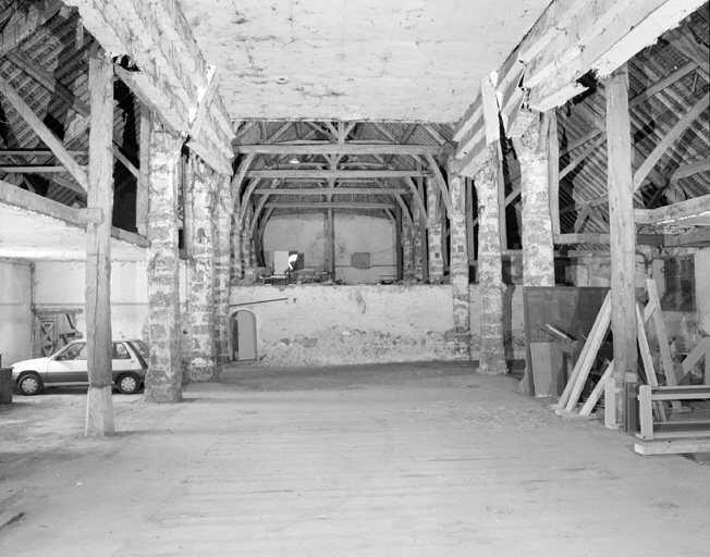 Le bâtiment forme un quadrilatère de 47, 30 m de long sur 19, 90 m de large. Le pignon est, sur le parc, est percé de deux oeils-de-boeuf et comporte trois contre-forts couverts de tuiles, tandis qu'à l'ouest le pignon est dans le prolongement du corps de ferme perpendiculaire à la grange. Le dessin des tuiles fait apparaître une croix au centre du pan nord de la toiture. La disposition intérieure comprend une nef centrale et deux bas-côtés. La largeur de la nef est de 9 m, celle des bas-côtés de 4, 5 m. Nef et bas-côtés sont délimités par deux alignements de 10 piliers chacun, 12 piliers en pierres, carrés, et 8 poteaux de chêne sur des socles en pierre.