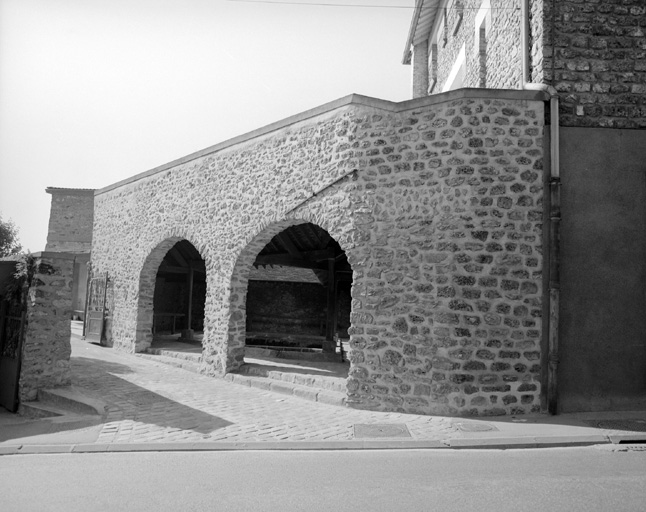 Le lavoir est fermé sur la rue par un mur en meulière et couvert d'un toit en appentis.