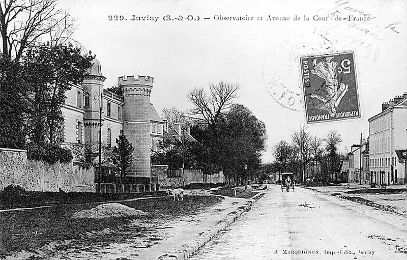 La "mazure de Frementeau", avec son clos, cour et jardin figurent sur le plan terrier du prieuré de Juvisy de 1551. En 1659, la ferme compte un corps de logis pour le fermier (couvert de tuiles, à pignon sur rue) , prolongé d'une écurie, avec un colombier abritant une laiterie, une étable à vaches et une bergerie, ainsi qu'une grange, un poulailler et une porcherie. En 1702, les Minimes rachètent la ferme dont ils agrandissent le logis en 1713-1714. En 1731, ils construisent une autre bergerie le long de la route de Paris. Informés du projet de détournement de la route de Paris lié à la construction du Pont des Belles fontaines en 1728, les R.P. Minimes de Paris font édifier en bordure de route une hôtellerie constituée d'un logis doté d'une grande écurie, capable de faire office d'auberge. Les bâtiments sont achevés fin 1730. Face à l'afflux de clientèle, le bâtiment est agrandi en 1731 de deux écuries et d'une remise surmontée d'un grenier. Au sud du corps de logis principal est ajouté une maréchalerie. En 1745, le toit du logis est couvert de tuiles. Exploitant le domaine depuis 1775, Charles Petit rassemble entre ses mains dès 1775 les activités de la ferme, de l'auberge et de la poste aux chevaux (passée des mains de René Angouillan à celles de sa tante Mosny) ; il profite de la vente des biens du clergé pour racheter en 1791 la ferme de Fromenteau et l'auberge de la Cour de France qu'il réunit en une seule entité. Après être passée entre les mains de son fils (Charles-Pierre) et de son petit-fils (Félix) , la propriété est cédée en 1840 à Narcisse Delorme qui la revend en 1856 à Louis-Eugène Méret qui conserve l'auberge mais fait raser les bâtiments de la ferme. En 1882, ce dernier fait don de sa propriété à Camille Flammarion qui s'installe à Juvisy pour y établir un observatoire. En 1894, Camille Flammarion achète les terrains inférieurs du parc (à la comtesse de Montessuy) pour y effectuer des études agronomiques et botaniques. Les deux parties du domaine sont bientôt réunies par une passerelle métallique - le pont du zodiaque - lancée au-dessus de la rue Camille-Flammarion par l'entrepreneur ingénieur Gilon qui réalisera dès 1884 la coupole de l'observatoire. En 1899, il confie à l'architecte François Giamarchi la transformation de la façade antérieure qui reçoit alors un décor de pilastres ioniques supportant une corniche. Après la mort de Camille Flammarion en 1925, sa veuve hérite du domaine qu'elle lègue, à sa mort en 1962, à la Société astronomique de France, jadis fondée par son époux. Cette dernière loue la propriété à la ville de Juvisy. Le site est classé MH en 1980 ; l'observatoire est inscrit MH en 1996.
