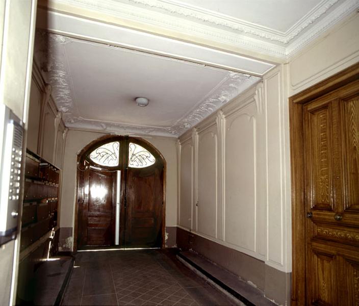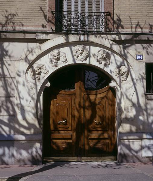 immeuble en brique en partie enduit ; porte de forme cintrée avec un décor de têtes de femmes ; vestibule avec frise animale et végétale