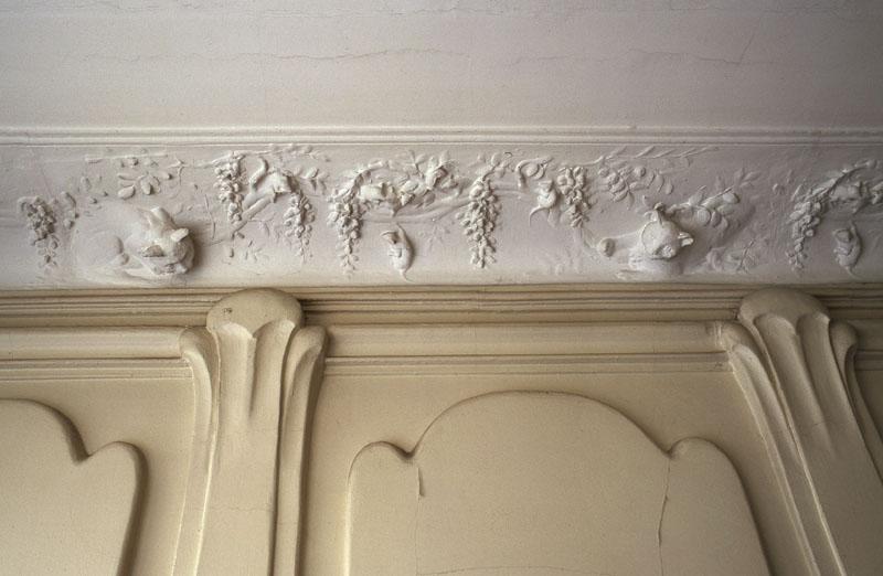 La porte d'entrée est ornée d'une série de têtes de femmes identiques ; le plafond du vestibule est décoré d'une frise en stuc représentant des chats et des souris s'ébattant dans des feuillages.
