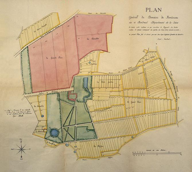 Emplacement d'un ancien fief, la seigneurie de Montreau, dépendant de la paroisse de Montreuil. Parmi les propriétaires successifs figurent le chevalier de Saint-Etienne, l'abbaye de Sainte-Geneviève, le marquis de Ménilglaise, M. Vassel (entrepreneur à Paris). Au XVIe siècle, le château de Montreau appartient à MM. Desjardins, conseillers au Châtelet et échevins de Paris. L'édifice consiste en une demeure bâtie sur un plan en L et comportant un étage carré et un étage de comble éclairé par des lucarnes ; le corps principal comprend 15 travées régulières en façade ; l'aile en retour d'équerre comprend 5 travées sur la façade sud. Le domaine comprend également une chapelle et un vaste parc composé de parterres et d'allées en étoiles, bien visible sur la Carte des Chasses. A la fin du 18e siècle, cette partie du parc est boisée. Le château est reconstruit à plusieurs reprises. Sur le cadastre de 1819, l'ensemble des bâtiments forme un quadrilatère avec un pigeonnier dans un angle ; sur le plan de 1847 (dit plan Rambuteau) , un des bâtiments a disparu. Le domaine est ensuite acheté par la communauté des dames de la Visitation en 1850, puis par Théophile Sueur en 1860, qui installe une fabrique de cuirs vernis dans les communs (300 à 400 ouvriers) ; deux des trois pièces d'eau du domaine servent à refroidir le cuir travaillé. Le château est démoli en 1870 car il gêne les tirs du fort de Rosny ; en même temps sont rasés les murs d'enceinte et la plupart des arbres du domaine. Le parc et la propriété sont acquis par la municipalité en 1932 (parc ouvert au public en 1934) ; en 1939 est inauguré le musée d'histoire vivante (association créée en 1937). La superficie est alors de 17 hectares (12 intra-muros et 5 extra-muros). La partie extra-muros, située derrière le parc, est constituée de terrains en partie plantés d'arbres fruitiers. La ville a fait clôturer les parties lui appartenant ; plusieurs chemins existants sont devenus viables (rue du Parc, rue Jules Guesde, rue Paul Lafargue). En 1956, des projets d'extension sont à l'étude par les architectes communaux Audra et Marme ; ils édifient la grille monumentale sur la rue du Parc. Vers 1935, le parc reçut des statues en pierre réalisées en 1878 pour le jardin de l'ancien Trocadéro : l'Eau ou nymphe à la source de Le Vau (env. 200 cm de haut) et l'Air ou nymphe au poisson ailé (env. 220 cm de haut) de Gabriel Jules Thomas (1824-1905) , toutes deux classées au titre des monuments historiques le 10/11/1980 (aujourd'hui déplacées pour raisons de conservation). Une réplique en marbre de l'Air se trouve dans le jardin public de Montélimar. Une autre statue en pierre calcaire, la Jeune femme au lévrier (200 cm de haut) , par Louis Henri Nicot (1878-1944) , subsiste à l'état de fragments (inscrite le 18/2/1980). En 1959, un an après la mort de Daniel Renoult, compagnon de Jean Jaurès, maire de Montreuil de 1944 à 1958, le parc est rebaptisé "Parc Montreau-Daniel Renoult" en commission des sites du département de la Seine. Un monument à Daniel Renoult, réalisé par le sculpteur René Collamarini (1904-1983) , est installé sur la pelouse centrale devant le château. Le parc actuel, d'une surface d'environ 15 000 mètres carrés, est inscrit à l'inventaire supplémentaire des sites. Il comprend un relief très vallonné offrant une large perspective sur les communes de Bry-sur-Marne et Villemomble, une roseraie, un centre horticole, des aires de jeux. En 1972, les anciennes écuries sont aménagées en foyer et en centre de séjour, puis en centre de santé.