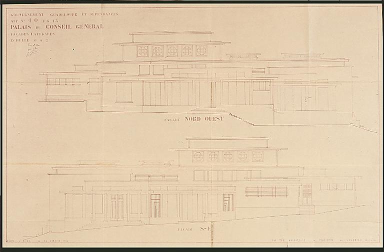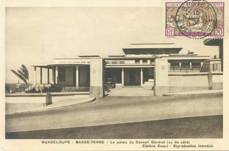 Le palais du conseil général et le palais de justice se font pendant de part et d'autre du boulevard Félix-Eboué, un des principaux axes de la ville. Le bâtiment est entouré d'un jardin clôturé d'une grille en fer forgé. L'entrée d'honneur, sur la rue de la République, ouvre sur un escalier extérieur monumental. Il existe deux autres accès pour les voitures sur le boulevard Félix-Eboué. La façade principale est bordée d'une galerie interrompue dans l'axe de l'escalier d'honneur par un porche monumental dont les quatre colonnes, doublées de piliers, portent un entablement avec des corniches saillantes. Les deux statues de Guadeloupéennes en tenue traditionnelle qui ornent les niches latérales ont probablement été ajoutées dans un second temps (elles ne sont pas signées). Le porche donne directement accès au bureau du président (au nord) , à la salle de réception (au sud) et à la salle des délibérations, qui est le coeur de l'édifice. La distribution des bureaux s'organise autour de cette salle presque carrée. Haute d'environ 10°m, elle est couverte, comme les salles d'audience du palais de justice, par un élégant plafond à caissons et est éclairée par des ouvertures carrées. À l'intérieur, ces baies sont dissimulées par des brises-lumières en béton formant des lames et tamisant la lumière. Les deux ailes ne sont pas symétriques : l'aile nord dispose d'un patio rectangulaire et l'aile sud-est se termine par une marquise en béton de forme arrondie. Ali Tur utilise comme pour le palais de justice la forte déclivité du terrain et avec la monumentalité de la façade principale pour inscrire son bâtiment dans la ville.