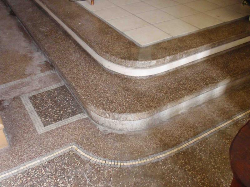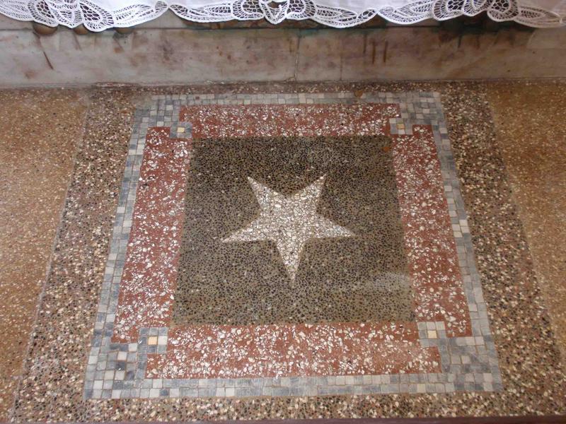 La couleur utilisée pour les vitraux est le jaune. Le revêtement de sol en carrelage est assemblé en motifs en croix et en étoile.