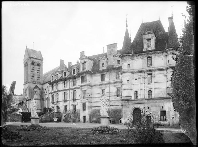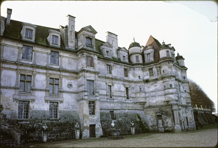 Dès le 11e siècle, le château défendait la frontière avec la Normandie. L'édifice actuel remonte au début du 16e siècle et au 18e, et domine un jardin en terrasses. Essentiellement vivrier jusqu'au milieu du 18e siècle, le jardin, clos de murs est d'abord " anglais ", avec pièces d'eau et bosquets. C'est en 1928 qu'il prend sa physionomie actuelle, à tendance italienne. La terrasse intermédiaire est dessinée à l'imitation d'un parterre d'eau de la villa Gamberaia, près de Florence. La terrasse supérieure s'inspire d'un tableau de Paul Brill (1554-1626) conservé à la villa Artena, près de Rome. Devant la demeure, la terrasse supérieure présente un alignement de la fin de l'Ancien Régime, conduisant à une vue dégagée sur la vallée. Un motif rayonnant de haies, une structure en damier avec topiaires évoquant un jeu d'échecs, témoignent de l'évolution, dans les années 1980, de l'aménagement conçu dans l'Entre-deux-guerres. Une serre, un pédiluve, et un verger complètent l'ensemble. Les communs datent pour partie du 17e siècle.
