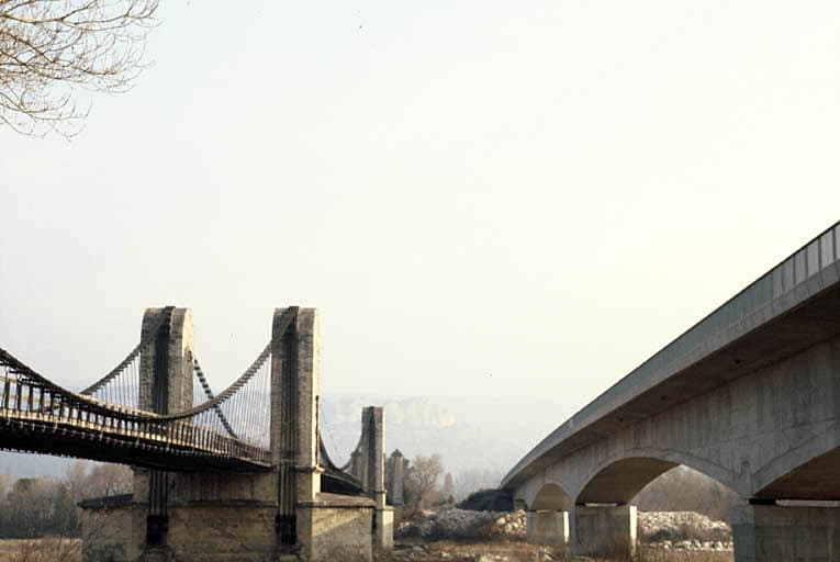 Cet ouvrage dart construit entre 1844 et 1848 sur le modèle des ponts suspendus dits « à fil de fer » des Frères Seguin, a été amélioré selon les innovations techniques dues à lingénieur Ferdinand Arnodin, à partir de 1882. Il fut restauré et consolidé, entre 1887 et 1892, après avoir été endommagé par les crues de 1872, 1881 et 1886. Cet ouvrage appartient à la première génération des ponts métalliques, améliorant la formule anglo-saxonne en substituant les suspentes en chaîne par des suspentes en fil de fer.