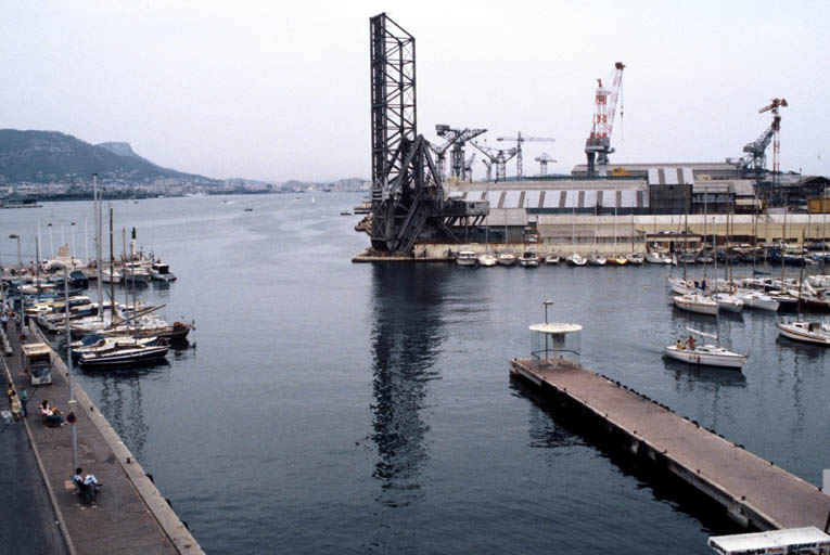 Les chantiers navals de la Seyne-sur-Mer sont créés en 1856 et produisent essentiellement des bâtiments pour la marine marchande. Le pont-levis est dessiné en 1914 et construit de 1915 à 1917 par l'entreprise Daydé et Pillé pour les Forges et Chantiers de la Méditerranée. Destiné à conduire la ligne du chemin de fer du PLM jusqu'aux chantiers navals, l'ouvrage métallique, financé par les dommages de la guerre, comporte une travée levante de 40 mètres de portée, pesant 123 tonnes, mue par un moteur électrique. Les pivots des articulations ont été changés en 1927 et en 1961, mais, n'étant plus en usage depuis la fermeture des chantiers navals dans les années 1980, le pont est mal entretenu et reste en position levée.