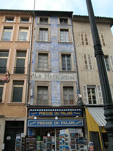 Cet immeuble de la fin du 18e siècle, qui fait face au Palais de Justice, possède une façade entièrement recouverte d'enseignes publicitaires peintes concernant la presse : "Journaux de Paris et de la région" (vers 1920), 'le Petit Marseillais", "Le Méridional" (vers 1960), "Jif Watermann", ...