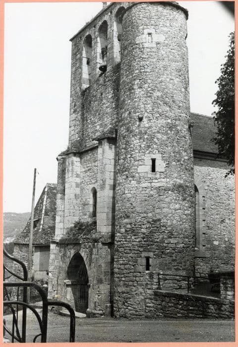 Cette église dépendait, au 13e siècle, de l'archiprêtré de Paleyrac et avait pour collateur la collégiale de Saint-Cyprien. En 1439, le sire de Turenne met le siège devant Allas, tenu par les Anglais, et le remet sous la dépendance française. L'édifice présente une nef à trois travées voûtées d'arêtes et un choeur. La troisième travée fait office de transept par l'adjonction de deux chapelles qui s'ouvrent par de grands arcs en plein cintre portés sur des pilastres. Le choeur, dont l'arc triomphal en plein cintre retombe sur des piles semblables à celles de la nef, est voûté d'un cul de four. £Sur la façade ouest partagée en trois registres par des plates bandes, le portail comporte trois archivoltes en tiers point retombant sur un bandeau sculpté qui se poursuit sur toute la profondeur du portail, faisant office de chapiteau. Les archivoltes sont prolongées par de petites colonnettes à bases sculptées. Le second registre comporte deux contreforts qui prolongent les piédroits du portail et entre lesquels s'ouvre une baie en plein cintre. Le troisième registre est formé par le clocher-mur rectiligne, percé de trois baies campanaires. £Cette façade est accostée au sud-ouest par une tourelle d'escalier cylindrique percée de meurtrières et ornée, au sud, d'une tête féminine. Sous la plate-bande du troisième registre sont sculptés deux écussons, l'un représentant trois quadrupèdes, l'autre deux quadrupèdes et une tête de bovidé.