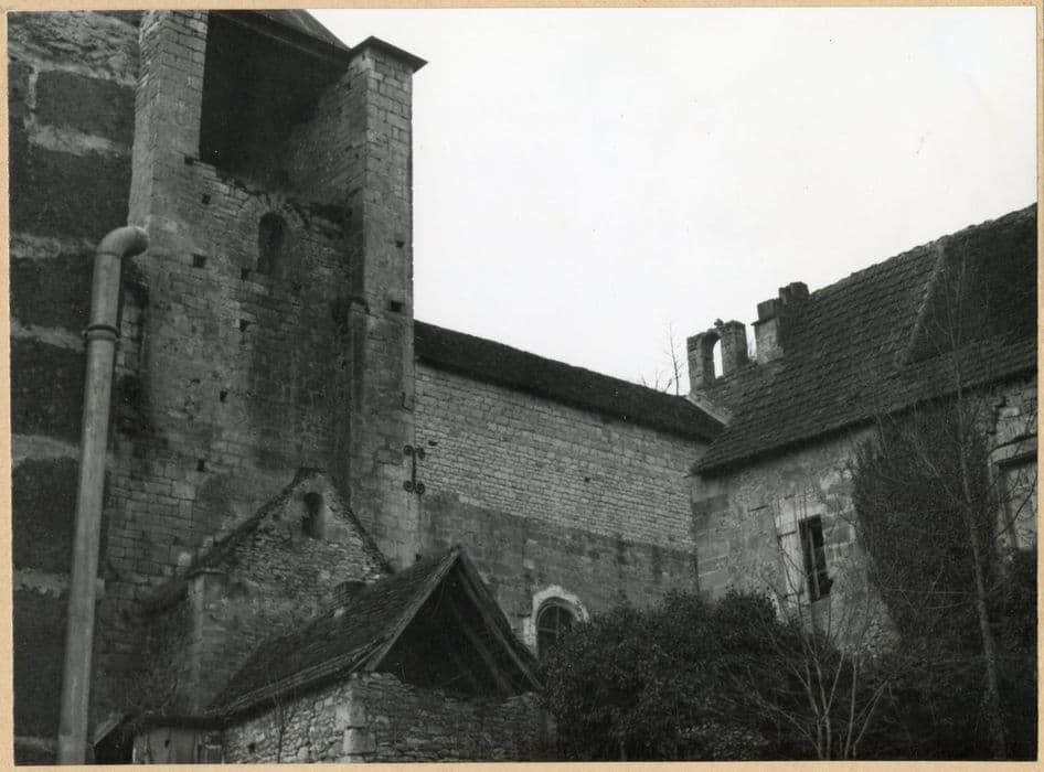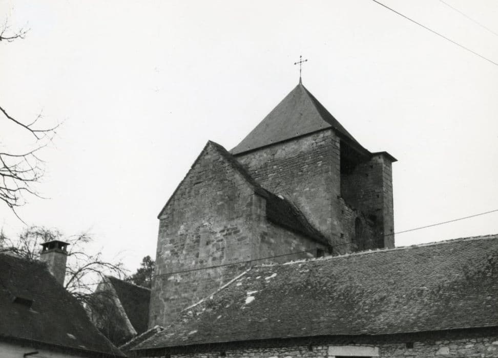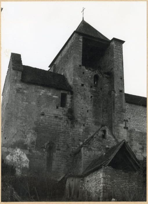 L'église du 12e siècle a été agrandie et fortifiée par la suite et souffrit des guerres de Cent ans au point que l'édifice fut en partie reconstruit au 15e siècle. La nef fut revoûtée très tardivement. £L'église, non orientée, comporte une nef suivie d'un carré de transept et d'un choeur à chevet plat. Le carré du transept, plus étroit que la nef, n'ouvre pas dans l'axe de celle-ci. Il en est séparé par des piles renforcées au 14e siècle et constitue, avec le choeur, la partie restant du 12e siècle. Dans la pile sud, un escalier à vis a été aménagé, desservant les combles et les défenses de l'édifice. Deux chapelles latérales ont été aménagées. Le choeur a été revoûté d'ogives au 15e siècle. Probablement assez endommagés lors des premières années de la guerre de Cent ans, la nef et le chevet ont été surélevés au 14e sècle pour recevoir des chambres de défense, au-dessus des voûtes. Le clocher, qui au 12e siècle s'élevait sur le carré du transept, a été modifié au 14e siècle. La face sud a reçu, au 17e siècle, un passage reliant l'église au presbytère.