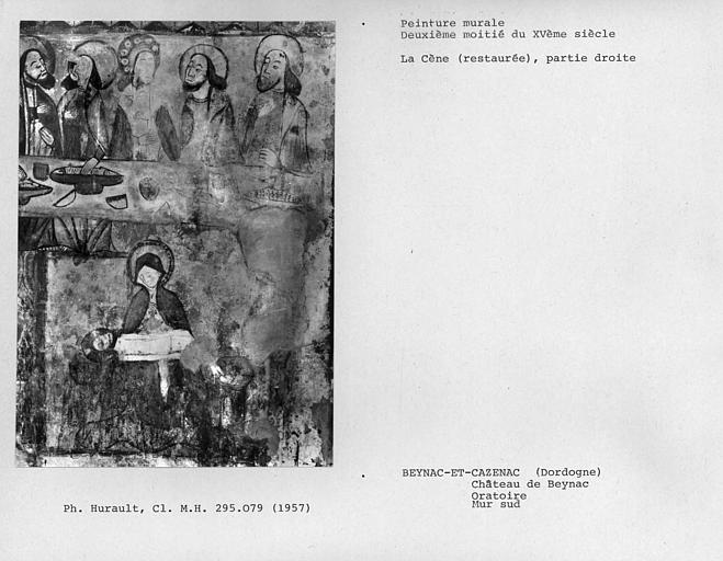 Le lieu a dû être occupé par une place-forte dès le haut Moyen-Age. A la fin du 11e siècle, l'existence des seigneurs de Beynac est attestée. Au début du 12e siècle, Simon de Montfort, chef de la croisade contre les Albigeois, fit détruire les murs et la tour du château. En 1238, la seigneurie de Beynac devient fief du comte de Toulouse. Par le traité de Brétigny, Beynac passa sous domination anglaise. En 1368, Beynac se rangea aux côtés de Charles V et entra en lutte contre les Anglais. ££Le château a conservé extérieurement toutes ses dispositions médiévales. Il se présente au bord du roc surplombant la Dordogne, en un vaste quadrilatère irrégulier. A l'angle nord-ouest se trouve le donjon carré, couronné de créneaux et flanqué d'une tourelle contenant l'escalier. Il est relié par un mur de courtine à mâchicoulis à une tour et au bastion méridional qui flanquait les faces ouest et sud. Ce bastion est couronné par un crénelage et deux tourelles cylindriques sur ses angles. Sur les faces sud et est du château se développent les corps de logis, remaniés au 16e siècle. Une tourelle en encorbellement a été ajoutée au 16e siècle. La face nord du château est fermée par un mur de courtine crénelé, renforcé à un angle saillant par une tourelle en encorbellement. A l'intérieur du château, une courette placée au centre éclaire les deux escaliers dont l'un dessert le donjon et les salles de défense ; l'autre, construit au 17e siècle, conduit aux appartements. Deux pièces décorées au 17e siècle présentent un décor d'entrelac et de rinceau sur les poutres et les boiseries, ainsi que des peintures. Aux abords du château se trouvent la poterne, les tourelles de défense, les bâtiments de communs se reliant avec les terrasses et l'église.££Sous le château se trouve un édifice auquel certains attribuent le rôle d'abbaye ou de prieuré. D'autres y voient l'ancien "présidial", qui s'élevait à mi-chemin du village et du château, ce qui semblerait plus plausible étant donné que cet édifice ne comporte que deux salles. C'est un bâtiment rectangulaire de deux étages sur rez-de-chaussée. L'entrée se fait sur la face ouest par une porte à linteau droit qui donne sur une pièce où s'élevait l'escalier conduisant aux étages. Les deux niveaux semblent n'avoir comporté qu'une grande salle chacun. Si le rez-de-chaussée et le premier étage ont leurs murs intérieurs en petit appareil plus ou moins régulier, le second étage en présente un régulier et bien assisé, qui tendrait à en faire une pièce d'apparât.