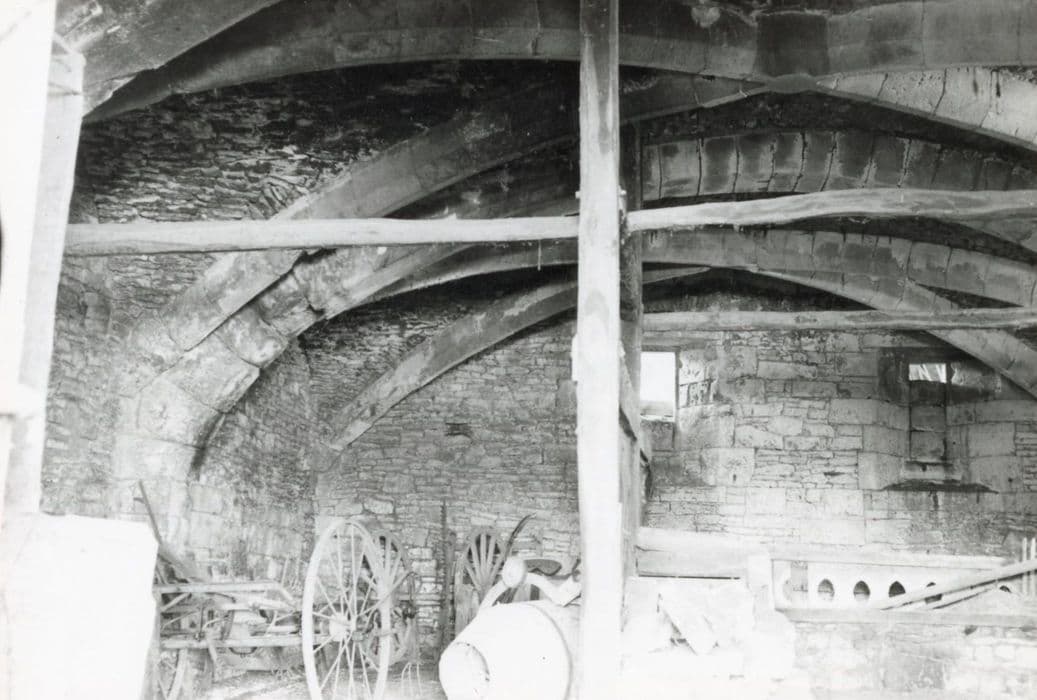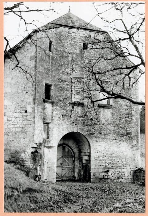 L'histoire locale attribue la construction de ce bâtiment aux Templiers et en fait une grange aux dîmes. La proximité de la commanderie de Saint-Jean de Condat pourrait accréditer cette croyance. Les arcs doubleaux et d'ogives des voûtes du rez-de-chaussée sont de facture archaïque et paraissent dater de la fin du 12e ou du début du 13e siècle. Cette grange subit une réstauration au 15e siècle et servit d'écuries au château. ££Le bâtiment rectangulaire se compose d'un rez-de-chaussée, d'un étage et d'un comble. A l'origine, il comportait sans doute une aile en retour, au sud-ouest. Une grande porte charretière ouvre, au nord, sur le rez-de-chaussée, sous un porche qui donne accès, à droite, à une sellerie ou réserve à grains ; à gauche, à une tourelle d'escalier. Doubleaux et arcs d'ogives ont été en partie refaits au 15e siècle. L'étage ne forme plus qu'une seule pièce mais laisse deviner qu'il était divisé en deux à l'origine. Lors du réaménagement du 15e siècle, une suite de quatre fenêtres à meneau horizontal fut percée à l'ouest.