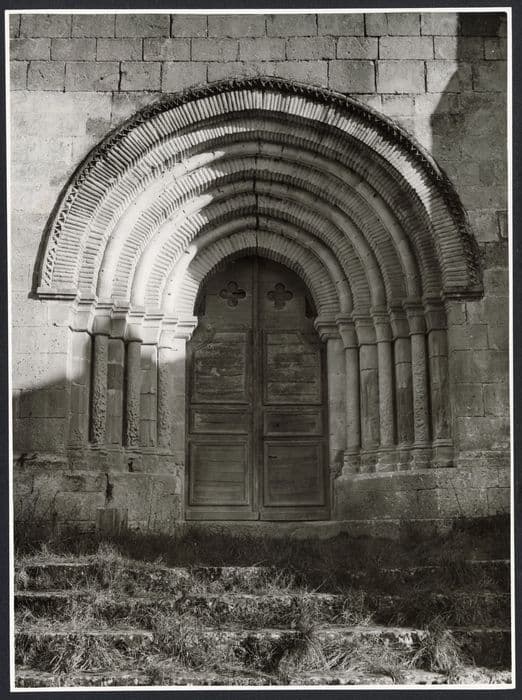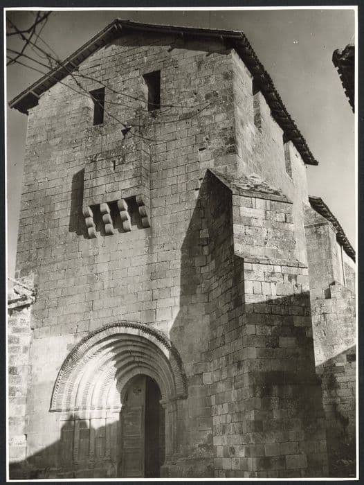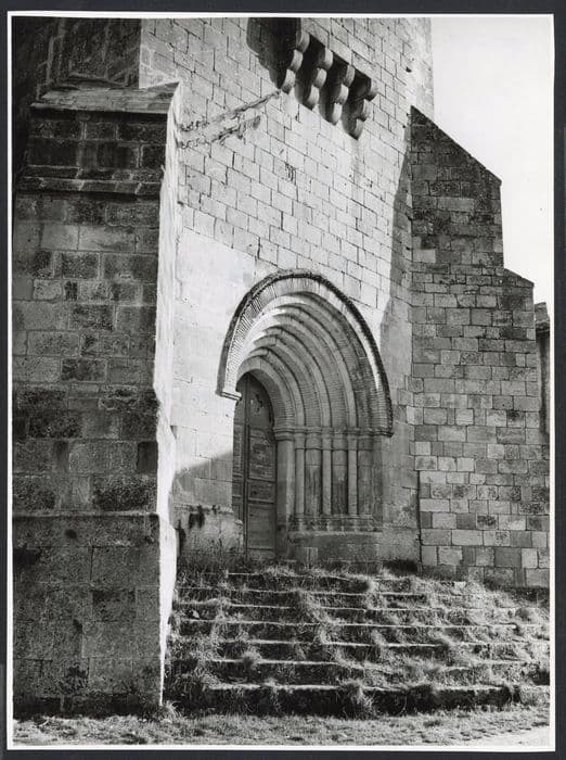 Il ne reste de l'église romane qu'un fragment du mur goutterot nord de la nef actuelle, orné d'une arcature brisée et d'un contrefort plat. Au 13e siècle, une travée fut élevée à l'ouest, sous un haut clocher fortifié. Cette partie a été depuis très retouchée avec l'ouverture, au 14e siècle, d'une chapelle et, au 16e siècle, d'une grande baie dans le mur sud. Au 16e siècle, l'édifice subit une reconstruction générale. Le choeur et la nef sont désaxés par rapport au clocher. La façade occidentale s'ouvre par un portail sous une bretèche. Elle s'amortit par un pignon aigu percé de deux baies rectangulaires. Le portail est d'un type unique en Périgord : quatre voussures légèrement brisées, séparées par trois tores lisses, retombent sur des colonnettes à chapiteaux frustes, reposant sur des socles élevés. Les faces verticales de chaque voussure et de l'archivolte sont ornées de stries rayonnantes. Un cordon d'archivolte à têtes de clous encadre l'ensemble. Les tailloirs forment, de chaque côté, un bandeau à huit ressauts.