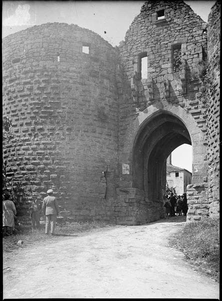 Au 13e siècle, la Guyenne et l'Agenais étant aux mains anglaises, le roi de France s'établit à Domme pour se défendre de ce voisinage. Une bastide royale fut créée et fortifiée. En 1347, le mont de Domme fut pris par les Anglais, mais repris l'année suivante par le sénéchal de Périgord. Le traité de Brétigny plaça cette forteresse sous suzeraineté anglaise, mais elle repoussa les attaques de 1370 à 1384. En 1417, Domme fut à nouveau occupée par les Anglais jusqu'en 1438. Pendant les guerres de Religion, Huguenots et Ligueurs prirent tour à tour la forteresse qui resta finalement aux Protestants jusqu'en 1592. ££Les remparts sont percés de trois portes : porte del Bos, porte de la Coumbo et porte des Tours. Bâtie en 1381 comme le reste de l'enceinte, cette dernière faisait pendant au double château qui couronnait la partie ouest. La porte est encadrée de deux tours massives, formée d'une longue voûte ogivale au sommet de laquelle deux ouvertures permettaient le passage des herses. Derrière chaque herse était une porte en bois qui se fermait par un système de ferrures et de poutres. Dans l'intervalle de ces deux portes, deux meurtrières en croix permettaient de défendre le passage. Une troisième est située dans la voûte. Des deux côtés des tours, une sorte de guérite fait saillie, servant de latrines à la garnison. Les chemins de ronde des plateformes permettent de passer d'une tour à l'autre, et datent probablement du 16e siècle, réalisés au cours des guerres de Religion.