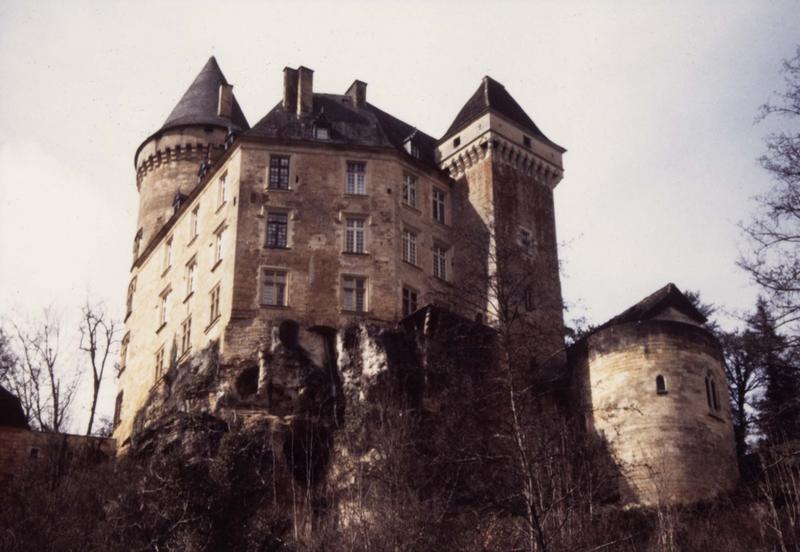 Château médiéval agrandi lors de la Renaissance. Edifice de plan irrégulier. Le corps de logis s'appuie sur un donjon carré et deux tours rondes à collerettes de mâchicoulis. La façade d'entrée a reçu, au 16e siècle, un corps de logis inscrit entre les tours, percé d'un porche, orné d'une lucarne à meneaux cruciformes et au fronton aigu. L'entrée est défendue par un châtelet rectangulaire à mâchicoulis, aux archères cruciformes et par un pont-levis. La porte du corps de logis porte la date de 1622. Dans la cour intérieure s'ouvre une porte Louis XII. ££Le château conserve un oratoire datant probablement du 14e siècle. Il occupe le rez-de-chaussée d'un donjon rectangulaire. Murs et voûtes en sont revêtus de peintures du 15e et du 17e siècle. Au centre de la voûte est assis le Père Eternel avec, d'un côté, Mathieu et Marc, de l'autre Luc et Jean. Sur le mur nord sont représentés Jésus chez Caïphe ; Pilate se lavant les mains ; Jésus tombant sous le poids de sa croix. Sur les écoinçons de l'arc de décharge du mur sud : Annonciation. Au-dessus de l'arc du mur ouest : entrée du Christ à Jérusalem ; agonie à Gethsémani. Le chevet plat s'organise en deux registres. Au registre inférieur, la composition s'organise autour du Christ mort, étendu sur un suaire. Le registre supérieur encadre la baie et présente : la Crucifixion ; donateur et donatrice agenouillés ; Saint-François d'Assise.