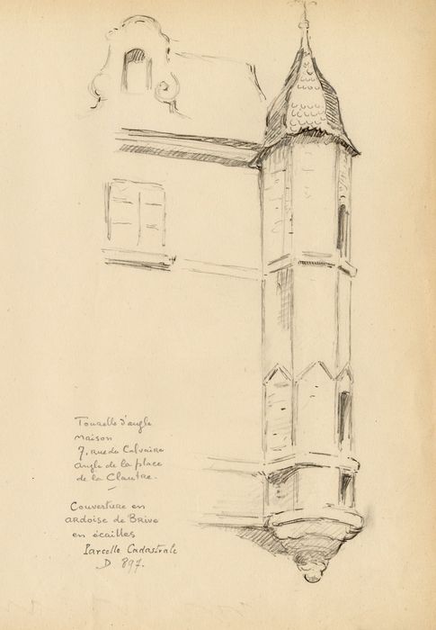 Immeuble Louis XV faisant un ensemble avec l'immeuble situé au 8 place de Clautre, de même époque. Tourelle en encorbellement à l'angle de la rue du Calvaire, coiffée d'ardoise de Brive en écailles de poisson. Toit à la Mansart, orné de lucarnes sculptées. La façade sur la place de la Clautre offre une partie incurvée au-dessus du balcon. La toiture débordante avance pour abriter le balcon.