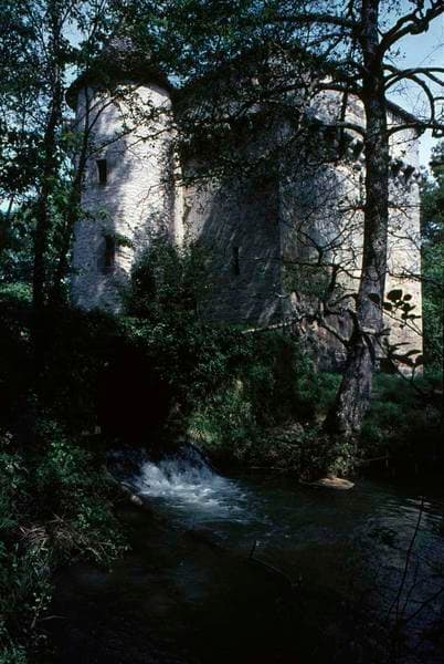 Reconstruit au 14e siècle, le moulin dépendait de l'abbaye de Blasimon. Bâti comme une maison forte, de plan carré, il présente six niveaux. Les 4e et 5e étages étaient réservés aux logements et le 6e étage est formé par le chemin de ronde établi au-dessus des mâchicoulis. Une tourelle d'escalier fut rajoutée au 15e siècle. Le moulin possédait deux roues hydrauliques, l'une horizontale, liée à l'activité meunière et l'autre, verticale, qui actionnait une batterie de foulon.