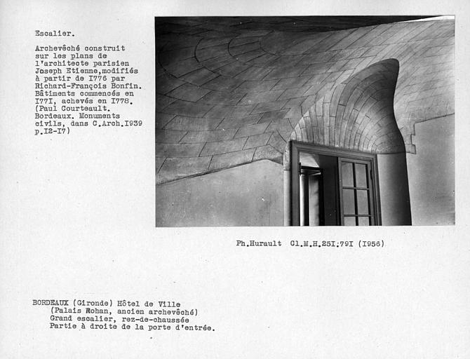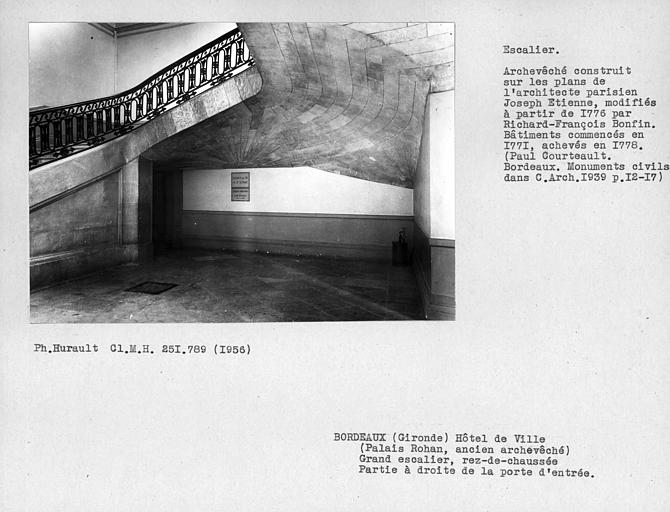 Nouveau palais archiépiscopal construit par les architectes Etienne et Bonfin entre 1771 et 1778. Hôtel de l'Archevêché jusqu'à la Révolution, siège du tribunal criminel en 1791, hôtel de la préfecture en 1802, palais impérial en 1808 et château royal en 1815, le Palais Rohan devient Hôtel de Ville en 1835. Deux incendies en 1862 et 1870 ont peu affecté les extérieurs, mais ont modifié la distribution et les décors intérieurs. Le décor intérieur a été réalisé par le sculpteur Cabirol à partir de 1781 (lambris du grand salon et décor du fronton de la façade sur jardin) et le peintre Lacour en 1783-1784 (décor en grisaille de la salle à manger). Quelques modifications de décor sont intervenues pendant le 19e siècle.
